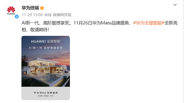 11月20日,@华为末端微博官宣:华为全屋智能将在11月26日的华为Mate品牌盛典全新亮相!那么这次华为全屋智能能给咱们带来哪些全新的惊喜体验呢?