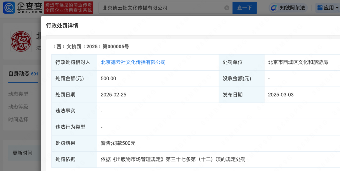 近日,北京德云社文化传播有限公司新增一条行政处罚信息,处罚效果为警戒;罚金500元,处罚单元为北京市西城区文化和旅游局,处罚依据为依据《出书物阛阓措置划定》第三十七条第(十二)项的划定处罚。