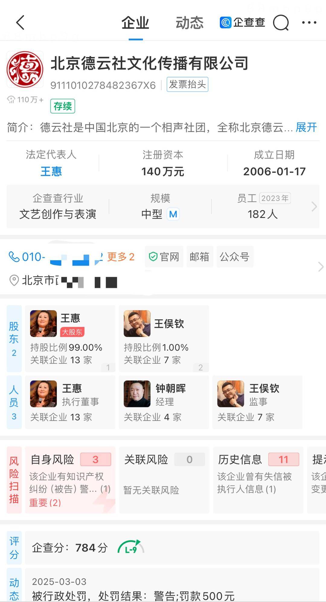 信息流露,该公司缔造于2006年1月,注册成本140万,郭德纲的夫人王惠担任法定代表东谈主并合手有99%股权,王惠的表弟及岳云鹏牙东谈主王俣钦合手股1%。记者张望出书物阛阓措置划定,第十二项为不按划定接管年度核验。