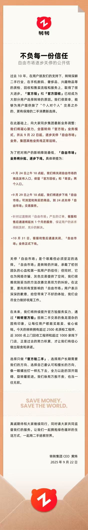 新浪科技讯 9月22日上昼音问现金万博manbext网站登录app平台,转转集团发布官方公告(以下简称公告),晓示将缓缓关停旗下“摆脱商场”业务。公告称,将来,转转将全力聚焦二手“官方验”业务风光,为用户提供除了“个东说念主对个东说念主”交游以外的、更有保险的二手破费新选拔。并强调集团其他业务线日常启动。